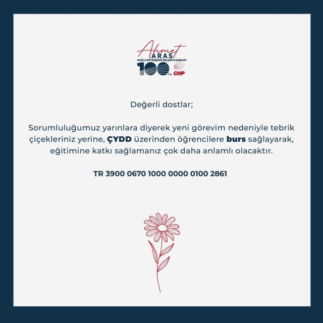 Muğla Büyükşehir Belediye Başkanı Ahmet Aras sosyal medya hesaplarından; “Değerli Dostlar; Sorumluluğumuz yarınlara diyerek yeni görevim nedeniyle tebrik çiçekleriniz yerine ÇYDD üzerinden öğrencilere burs sağlayarak eğitimine katkı sağlamanız çok daha anlamlı olacaktır.” Paylaşımı yaparak Çağdaş Yaşamı Destekleme Derneği’ne ait olan TR 3900 0670 1000 0000 0100 2861 nolu hesap numarasını paylaştı.