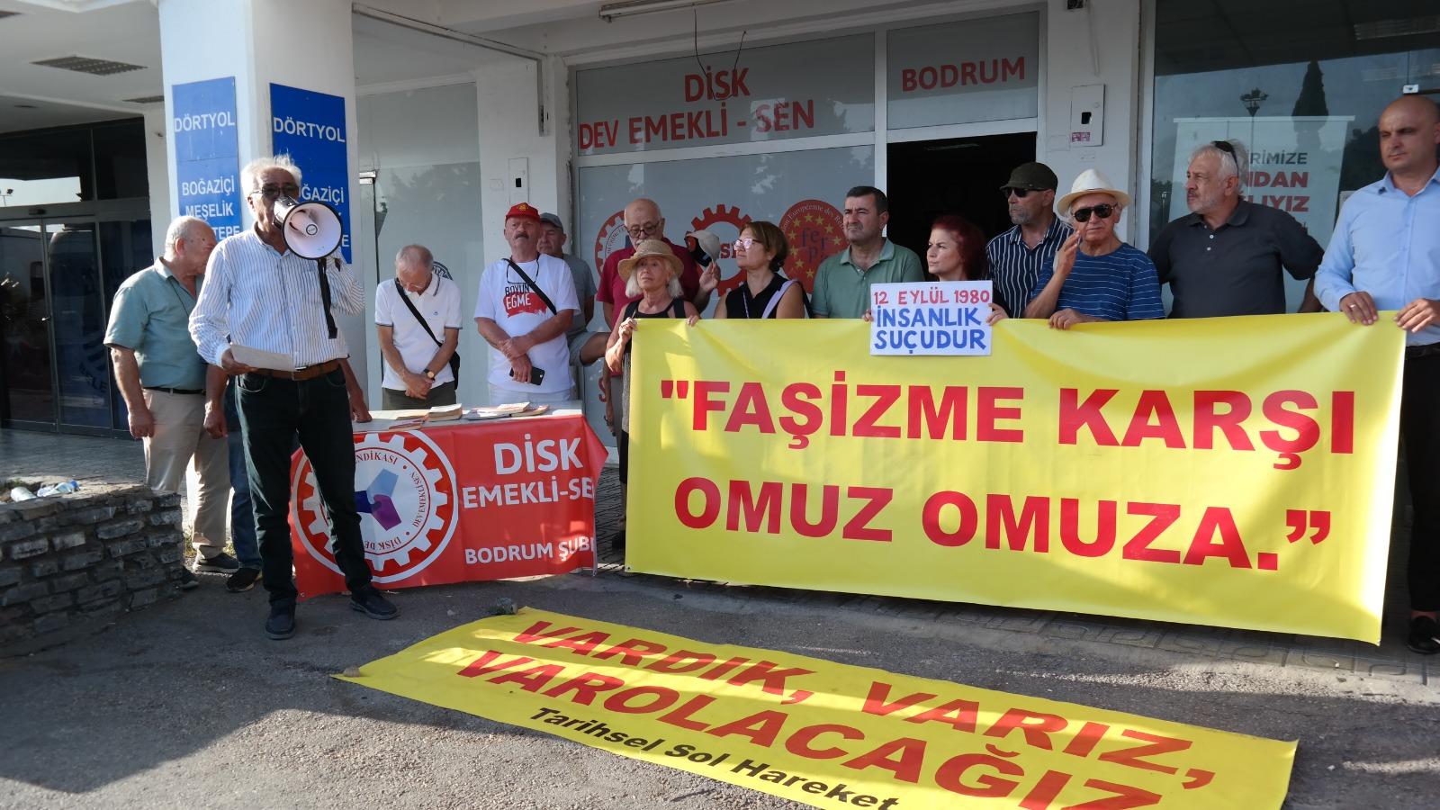 DİSK’e bağlı Devrimci Emekliler Sendikası Bodrum Şube Başkanı İbrahim Uzun’da topluluğa hitaben; “12 Eylül sabahı, beş general yönetime el koydu. Meclis’i feshetti, anayasayı askıya aldı, siyasi partileri kapattı. Hedeflerinden biri de Devrimci İşçi Sendikalar Konfederasyon’uydu. Kayyım atadı, mal varlıklarına el koydu, bağlı sendikaların faaliyetleri durduruldu, üyeleri gözaltına alındı, 100 günü aşkın işkence yapıldı, 78 yöneticinin idamı istendi, toplamda bin 477 kişi yargılandı. 12 Eylül’de idama varan yüksek cezalandırmalar karşısında dönemin Genel Başkanı Abdullah Baştürk’ün askeri savcıya söylediği ‘Siz ancak benim ceketimi asarsınız’ sözünü halen çok kıymetli bir direniş nişanı olarak mücadelemizde taşıyoruz. DİSK 12 Eylül mahkemelerinde adeta bir direniş destanı yazmıştır. DİSK’in tarihi sadece bir gelenek değil, esasen gelecektir” görüşlerini dile getirdi. Etkinlikte Bodrum TKP yöneticilerinden Hasan Hüseyin Yalçın ve Yalıkavak İnisiyatifi’nden Mehmet Doğan’da 12 Eylül darbesine ilişkin görüşlerini ifade ettiler. Eylemde sık sık; “Faşizme Karşı Omuz Omuza”, “Birleşe, Birleşe Kazanacağız” sloganları atıldı.