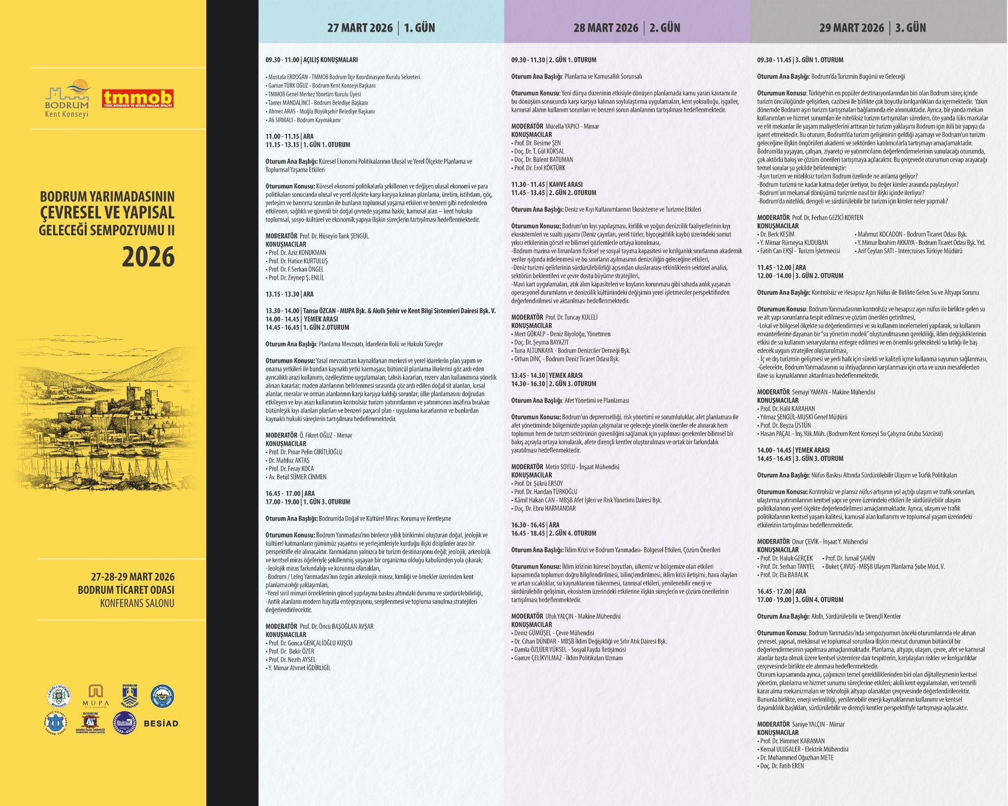 Bodrum Kent Konseyi ve TMMOB Bodrum İlçe Koordinasyon Kurulu işbirliği ile düzenlenen, ilki 2008 yılında gerçekleştirilen “Bodrum Yarımadasının Çevresel ve Yapısal Geleceği Sempozyumu”nun ikincisi, 27-28-29 Mart 2026 tarihlerinde Bodrum Ticaret Odası Konferans Salonu’nda düzenleniyor.