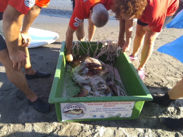 Denize giren ekip kaplumbağanın öldüğünü anladı. Ağla denizden alınan yaklaşık 60 cm boyunda 50 kilo ağırlığındaki caretta caretta türü deniz kaplumbağası Ortakent koyuna getirildi. Turistlerin ve vatandaşların şaşkın bakışları arasından araca yüklenen kaplumbağa Akut hareket merkezine getirilerek Deniz Kaplumbağaları Araştırma, Kurtarma ve Rehabilitasyon Merkezin yetkililerine teslim edildi.