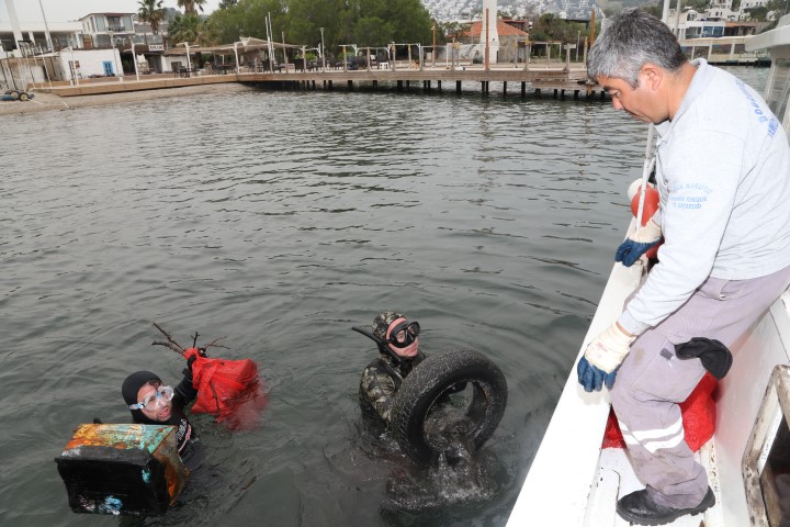 Gündoğan plajı ve liman içinde yapılan çalışmada Bodrum Belediyesi Dalış Ekibi, yaklaşık iki saat boyunca deniz dibinde biriken atıkları topladı. Dalışa Muğla Gençlik Hizmetleri ve Spor İl Müdürü Serkan Öçalmaz da katılarak destek verdi.