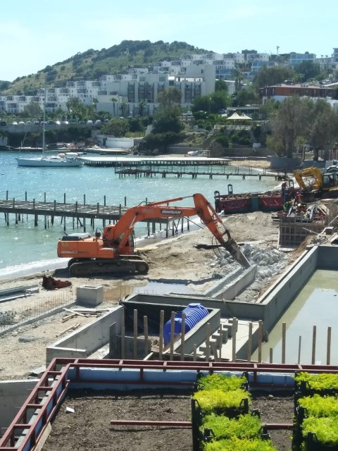 Gümbet’te bir yatırım ortaklığına ait otel ve rezidans projesinin kaçak olan bölümleri, Bodrum Belediyesi ekipleri tarafından tespit edilmiş, tutanak tutularak, kaçak olan uygulamaların ortadan kaldırılması için işletme sahiplerine süre verilmişti. Belediyenin gerekli uyarılarının ardından firma, kaçak olan bölümleri kendi imkanları dahilinde kaldırabileceğini bildirerek harekete geçti. Bodrum Belediye ekipleri gözetimindeki çalışma kapsamında, projeye aykırı olduğu tespit edilen ve sahile inşa edilen havuz ile çelik konstrüksiyonlu bir ünitenin yıkım işlemleri başlatıldı.