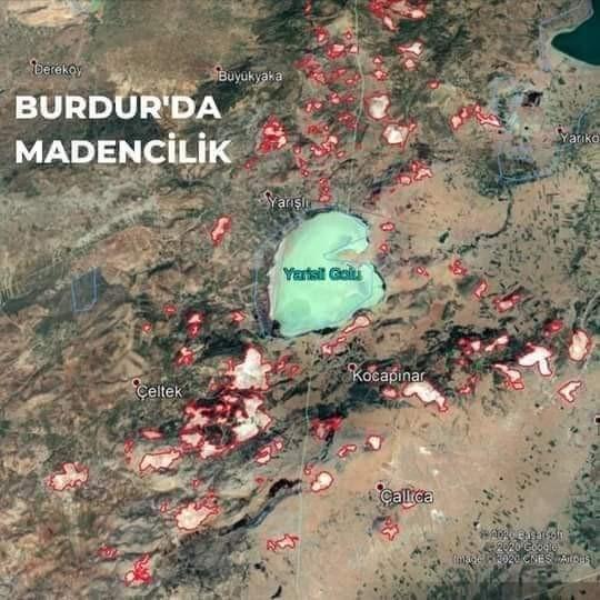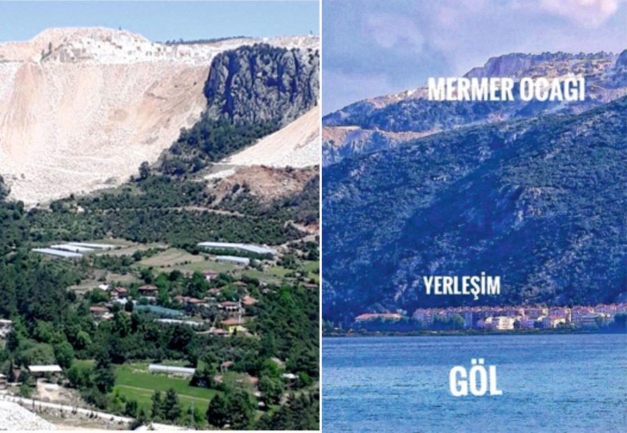 Burdur-Karamanlı-Yeşilova-Yarışlı Gölü çevresindeki mermer ocaklarının uydu görünümü. Açık görünen yerler mermer ocaklarıdır. Mermer ocaklarının doğaya yaptığı tahribatın boyutları açıktır. Sel sularıyla göle gelen mermer çamuruyla Yarışlı gölü artık dolmak üzeredir. Mermer ocaklarının su deposu konumundaki kireçtaşı kayalarını yok etmesiyle göl kurumaya yüz tutmuştur.
