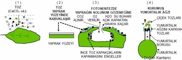 3- İnce toz yaprağın solunum gözeneklerini tıkar. Gözenek kapakçıklarının kapanmasını engeller. Gözenek kapakçıkları kapanamayan yaprak devamlı terleme ile su kaybeder ve bir tür “fizyolojik kuraklık etkisi” olayı gerçekleşir [6].