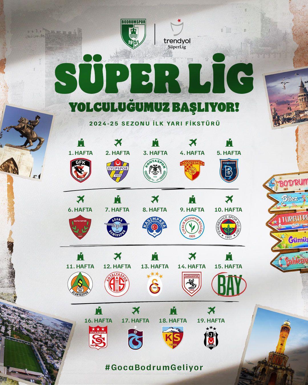Trendyol Süper Lig’deki ilk maçında kendi sahasında Gaziantep FK ile karşılaşacak olan Sipay Bodrum FK, ligin 10. haftasında Fenerbahçe ile, 13. haftasında Galatasaray ile, 19. haftasında ise Beşiktaş ile karşılaşacak.