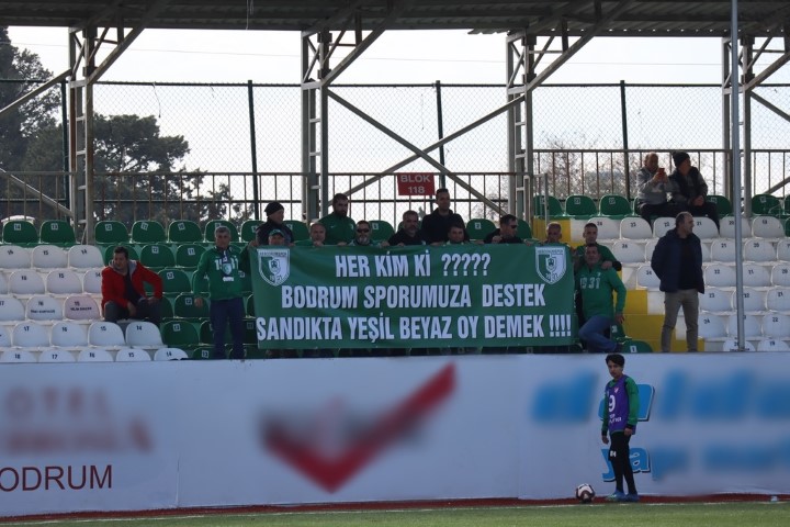 Erdoğan Çakmak Tribününde bulunan bazı taraftarlar yaklaşan yerel seçimler nedeniyle siyasilere pankartlı çağrıda bulundu. Maç öncesinde açılan pankartın üzerinde, ” Her Kim ki !!!! Bodrum Sporumuza Destek Sandıkta Yeşil Beyaz Oy Demek” yazıyordu.